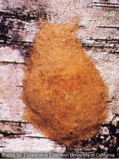 The egg mass is light brown, covered with yellowish hairs and is approximately 1 inch long and 3⁄4 inches wide. Each egg mass contains approximately 1,000 eggs. Caterpillars are gray, with red and blue dots on their backs and are from 1 1⁄2 to 2 1⁄2 inches in length. The female moth is white, has a 2 inch wingspread and is unable to fly. The male moth is gray-brown and has a 1 1⁄2 inch wingspread. The pests do not feed in the moth stage, but only mate and lay eggs.