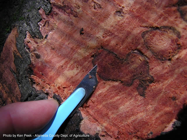 Photo of Sudden Oak Death-infected tissue from Coast Live Oak.