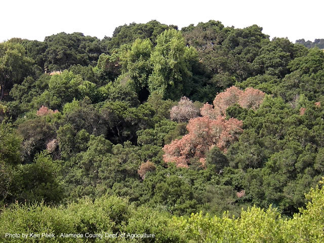 Alameda County is one of fourteen regulated counties in California where SOD is known to occur. This plant disease is caused by the pathogen Phytophthora ramorum, a fungus-like organism that thrives in the moist climate found along coastal California. Although a number of native and ornamental species are known hosts for this disease, Coast Live Oaks, Tan Oaks and Black Oaks can actually be killed by it.