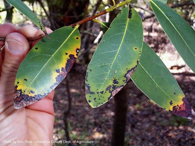 Photo of spotting on bay leaves caused by  Sudden Oak Death.