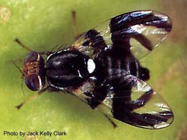 Males are slightly larger than females, averaging 4.5 mm. long. The adult is blackish in color with a white triangular structure (scutellum) at the base of the thorax. The abdomen is marked with four white cross bands. Wings are marked with distinct black bands. Commonly confused with Apple Maggot Fly and Medfly.