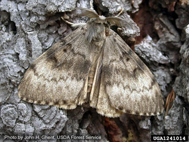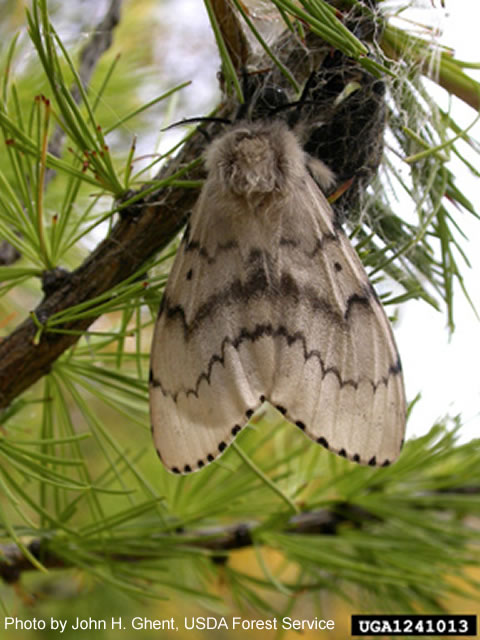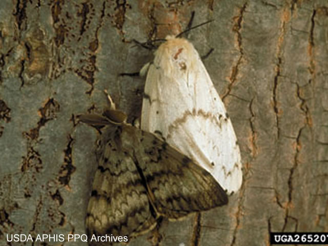 This moth closely resembles the female European Gypsy Moth but is larger. Females have a wing span of 3 ½ inches or more. Asian Gypsy Moth differs from the European stain by its ability to fly up to two miles and the fact that the larva will feed on conifers.