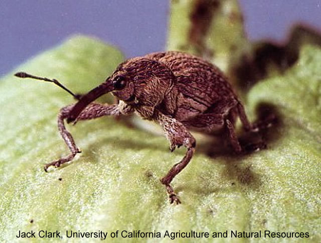 Adults have a striking appearance in form and in color. They are red and metallic bluish-black with a long snout projected forward. The adults measure 5.5-8.0 mm. long. They may have as many as eight generations per year. SPW are a serious pest of sweet potatoes, not only in the U.S., but around the world.
