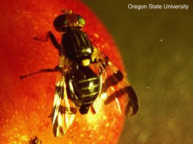 Adult fly is 1/4 inch (5-7 mm.) long, shiny black with white lines on sides of thorax and a white triangular scutellum at base of thorax. Females have four white cross bands on the abdomen, males have three. Wings have a black F-shaped marking. A serious pest of apples, also known to infest plum, peach, crabapple, sour cherry and ornamental hawthorn. This pest is present in some areas of Alameda County.