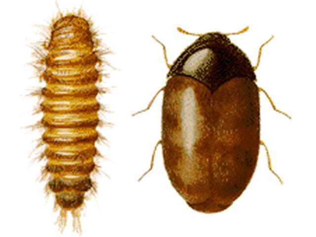 Adult beetles are oval shaped, dark brown, and have smudgy yellowish-brown and reddish-brown transverse stripes on the wing covers. They are covered with fine hairs. Males are about 2 mm. long and females up to 3 mm. long. Larva is yellowish brown, spindle shaped and grow to 5 mm. long. Larva has thick reddish brown hairs and characteristic bunches of tail hairs growing off the rear. Learn more...