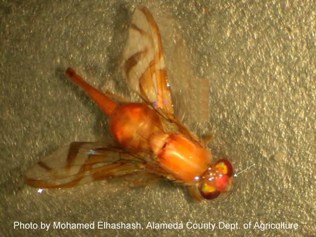 Female flies are easily identified by their large ovipositor. Sterile Release fruit flies are marked with a fluorescent pink or orange dye that can be readily identified under ultraviolet lights. At times the dye can be detected under a microscope. Note the pink glow in the head capsule. All flies are sent to the State of Calif. Plant Pests Diagnostic Center for positive identification.