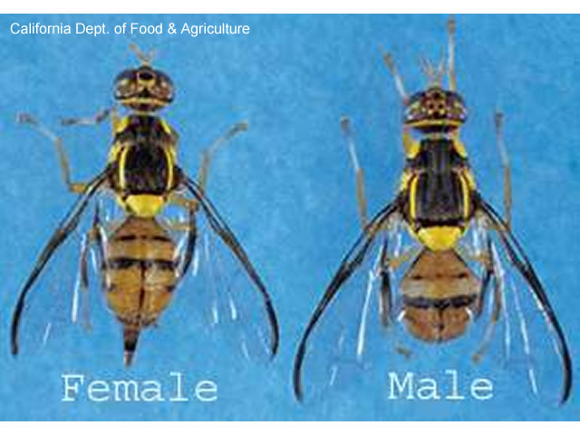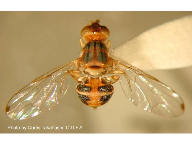 Similar to Oriental Fruit Fly, but smaller, measuring about 6mm. in length, with a darker, mostly black thorax. Body and legs are honey colored with a prominent black "T" marking on the abdomen. Wings are clear with a spot on the wing tips. Often confused with Peach Fruit Fly and Olive Fruit Fly. Learn more...