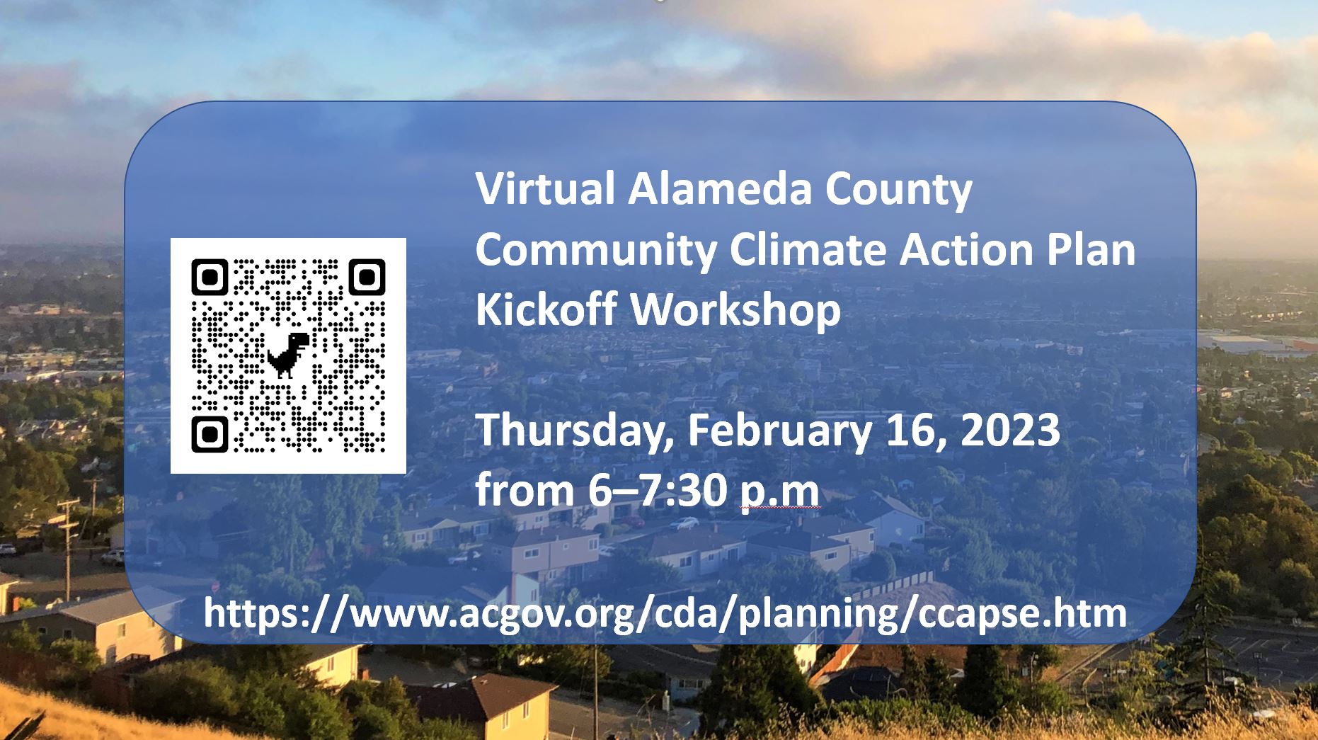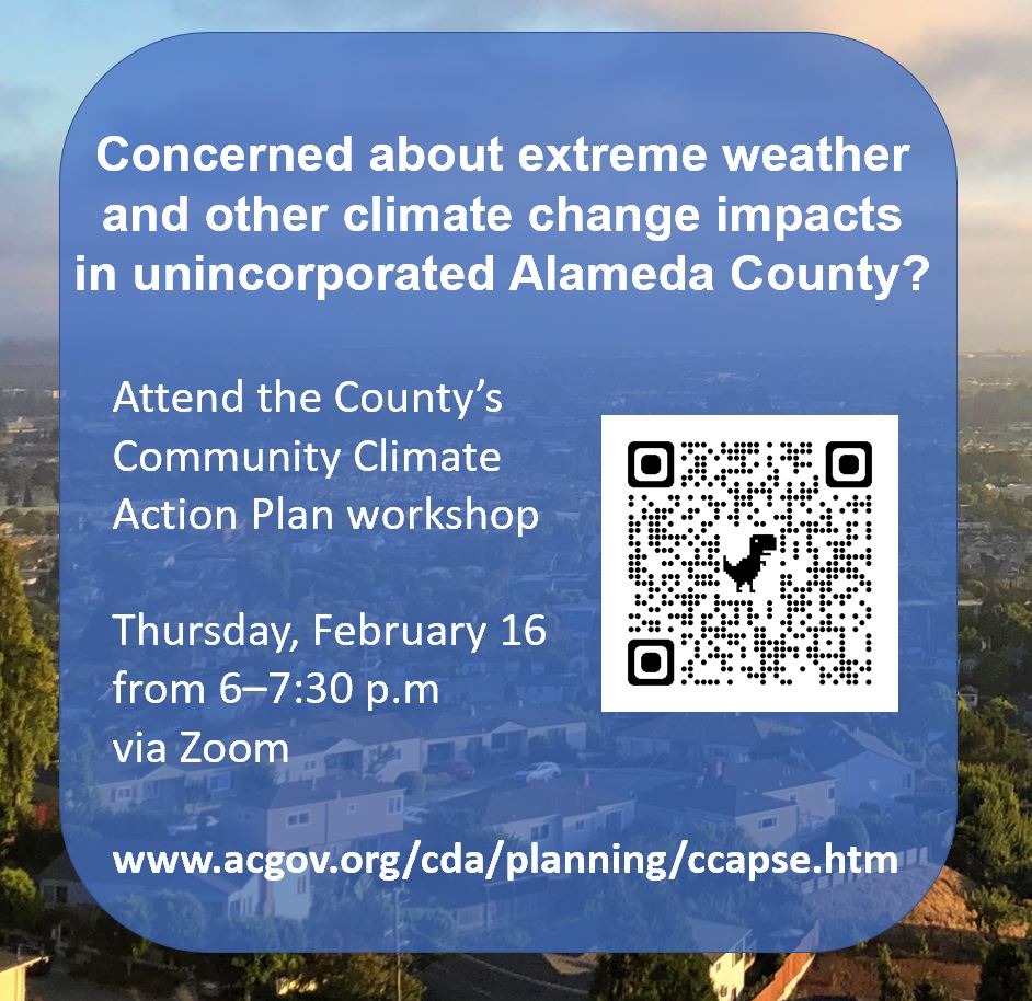 - ENGLISH: Has your community been impacted by extreme weather events, flooding or wildfire? Alameda County wants to hear from you! Register for the Virtual Alameda County Community Climate Action Plan Kickoff Workshop on Feb. 16 from 6-7:30 pm: https://acgov.org/cda/planning/ccapse.htm