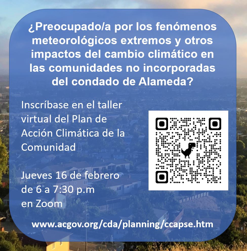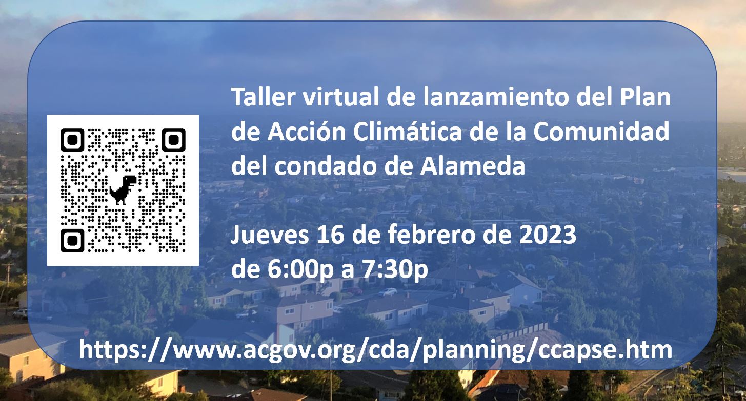- SPANISH: ¿Su comunidad se ha visto afectada por fenómenos meteorológicos extremos, inundaciones o incendios forestales? El condado de Alameda desea recibir sus comentarios. Inscríbase en el taller virtual de lanzamiento del Plan de Acción Climática de la Comunidad del condado de Alameda, que se llevaráa cabo el 16 de febrero de 6 a 7:30pm: https://acgov.org/cda/planning/ccapse.htm